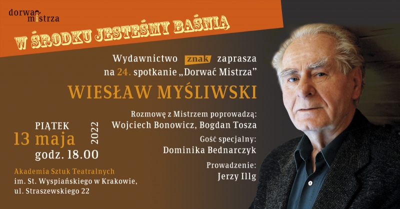 W piątek 13 maja o godz. 18 zapraszamy do Akademii Sztuk Teatralnych w Krakowie na spotkanie z Wiesławem Myśliwskim. Rozmowę z Mistrzem poprowadzą: Wojciech Bonowicz i Bogdan Tosza. Prowadzenie wieczoru: Jerzy Illg. Gość specjalny: Dominika Bednarczyk